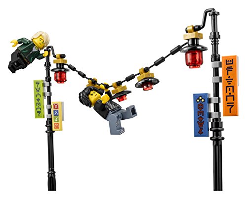- Inclut également 2 lampadaires avec des éléments décoratifs transparents et des éléments lumineux rouges transparents, ainsi qu’une chaîne pour accrocher les lanternes de fête NINJAGO® avec des éléments lumineux rouges transparents.
